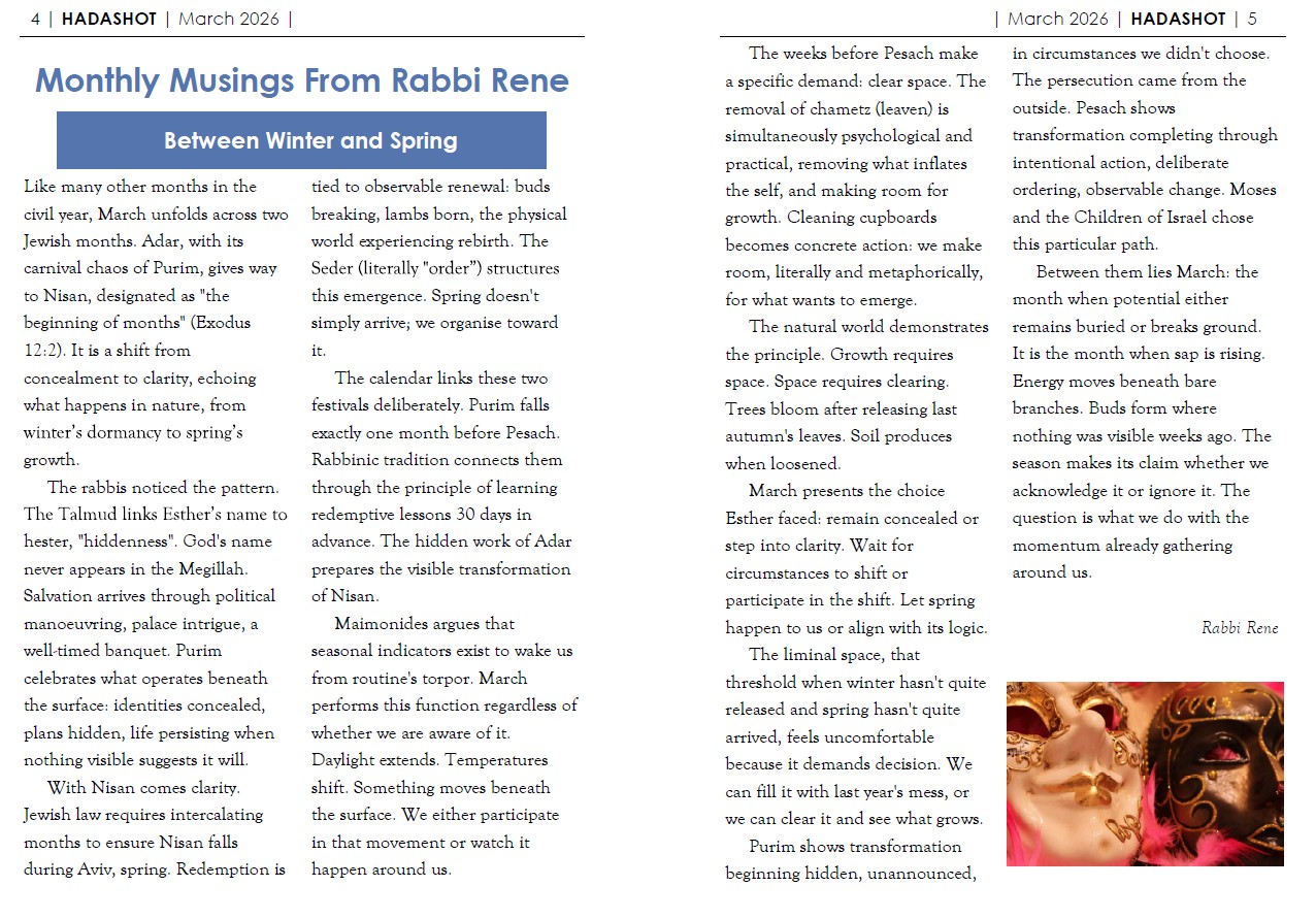 Click here to read RabbisMusings_Mar2026 about Rabbi Rene’s thoughts that explains that March, bridging Purim in Adar and Pesach in Nisan, symbolizes the movement from hidden beginnings to visible renewal, urging us to clear space in our lives so that transformation and growth can emerge.